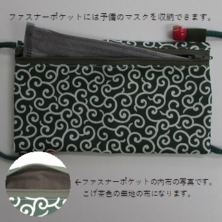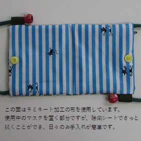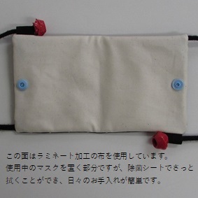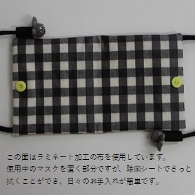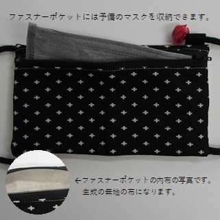 マスクの仮置き部分はラミネート加工の布を使用していますので、お手持ちの除菌シートなどでさっと拭くことができます。また、ファスナーポケットには予備のマスクなどを入れておくこともできますが、普通の布と比べてラミネート加工の布の方が清潔に予備のマスクと使用中のマスクを仕切ることができます。